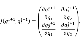Por tanto, la matriz jacobiana de la función vectorial 𝑓=(𝑞1𝑡+1,𝑞2𝑡+1), o del sistema 4, es