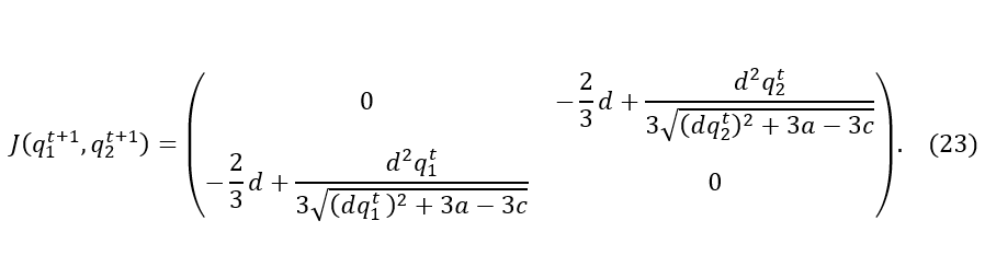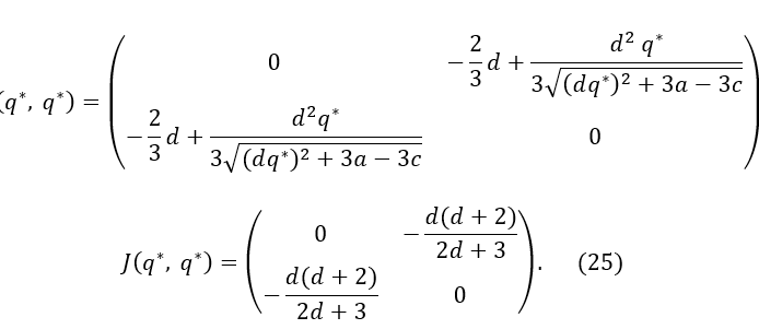 De la ecuación (24) se deduce que, al evaluar la matriz jacobiana 𝐽(𝑞1𝑡+1,𝑞2𝑡+1) en el equilibrio de Nash simétrico