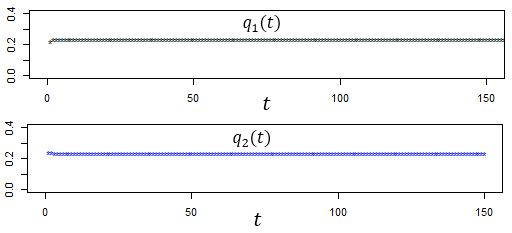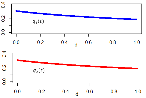 La figura 1 muestra la estabilidad del equilibrio de Nash cuando el tamaño del mercado es 0.5 y el costo marginal es igual a 0.2 . Nótese que los valores de 𝑥 e 𝑦 son idénticas para cada valor de 𝑑; además la gráfica es continua y decreciente en correspondencia con el decrecimiento del punto de equilibrio a medida que aumenta el grado de diferenciación. La figura 2 muestra dos trayectorias de 𝑞1(𝑡) y 𝑞2(𝑡) para valores iniciales (𝑞10, 𝑞20)=(0.5,0.1), (𝑞10,𝑞20)=(0.5,0.3) y parámetros 𝑎=0.5,c=0.2 y 𝑑=0.5, con el tiempo variando de 0 a 150.