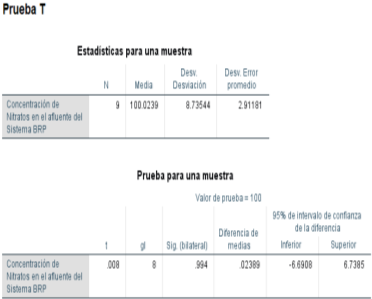 La determinación de la concentración media de la muestra se efectuó por medio de la distribución T de Student en el programa SPSS Statistics. Estableciendo una concentración de nitratos en el afluente del sistema de cada una de las barreras de 100 mg/L.