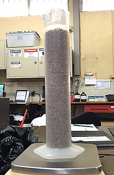 Utilizando una balanza analítica se pesó una probeta graduada de 1000 ml, este proceso de pesado de la probeta de realizo aproximadamente unas 20 veces para obtener un peso constante, con variaciones no mayores al 4%, así mismo se determinó el promedio y coeficiente de variación de las mediciones. Una vez que se obtuvo un peso constante, de la misma manera se procedió a pesar la misma probeta, pero con esta vez aforada con sustrato de carbono orgánico (aserrín) hasta obtener un peso constante, con variaciones no mayores al 4% y de igual manera se estimó el promedio y el coeficiente de variación.