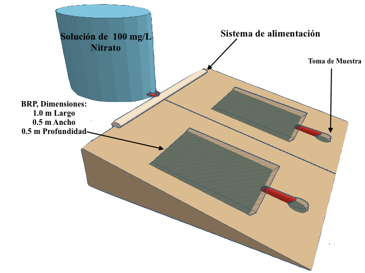 La toma de los parámetros de campo más el monitoreo de las barreras se elaboró en el efluente del sistema con la finalidad de evaluar la eficiencia en cuanto a la reducción de la carga de nitratos suministrada a través del sistema de simulación de escorrentía superficial de agua agrícola. Dicha eficiencia será medida o expresada como eficiencia de remoción.