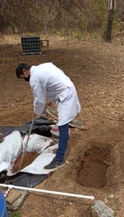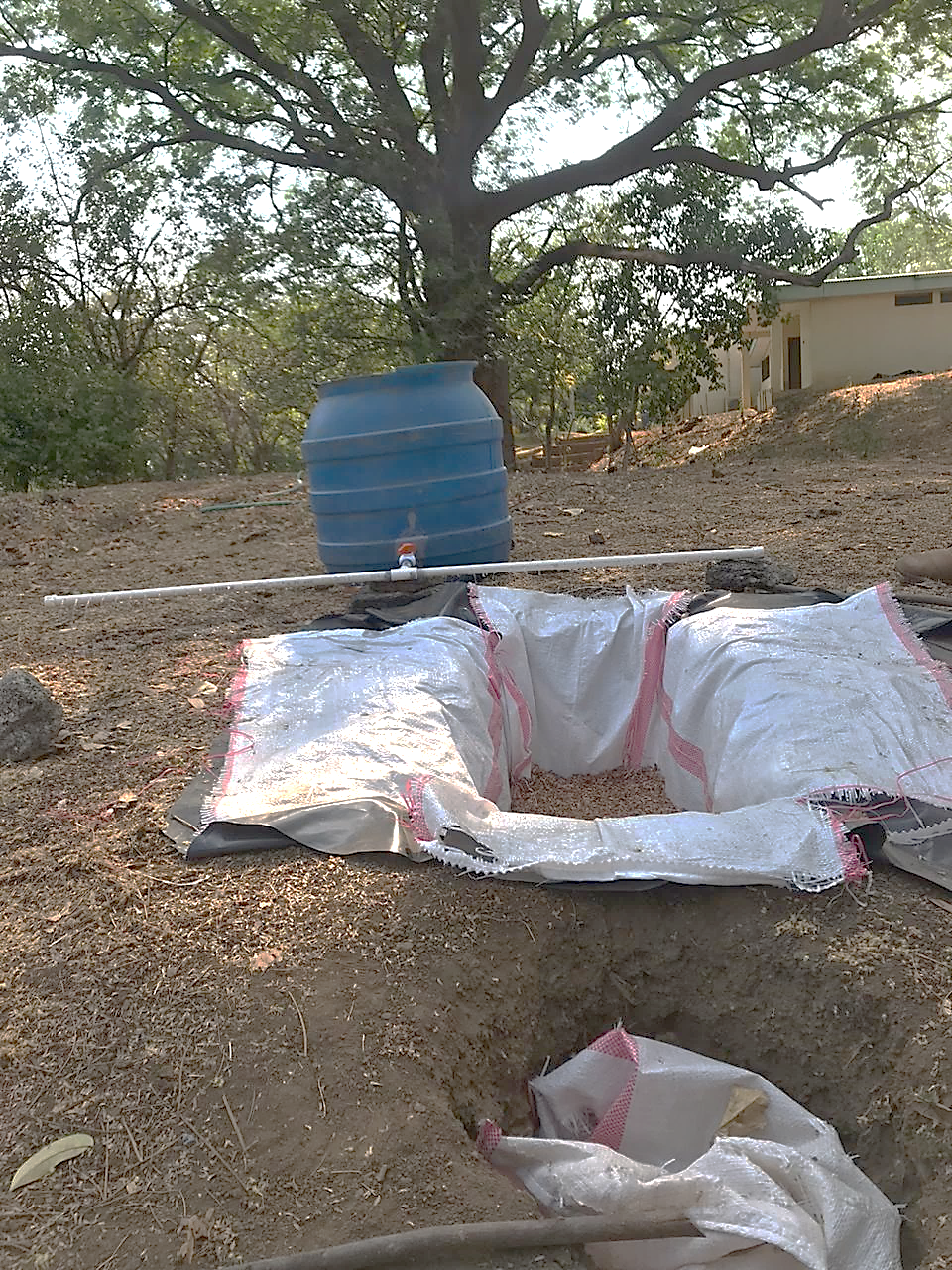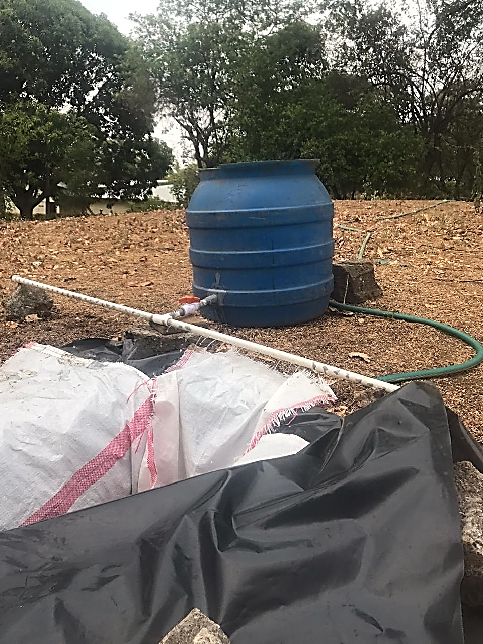 Se elaboraron dos barreras, en el sitio previamente seleccionado con las siguientes dimensiones: 1.0 metro de largo, 0.5 metros de ancho y 0.5 metros de profundidad, para impermeabilizarlas y evitar pérdidas de agua por infiltración en el suelo se utilizaron sacos macen y plástico negro, además de impedir la contaminación cruzada por el contacto con el suelo o pluma contaminante.
