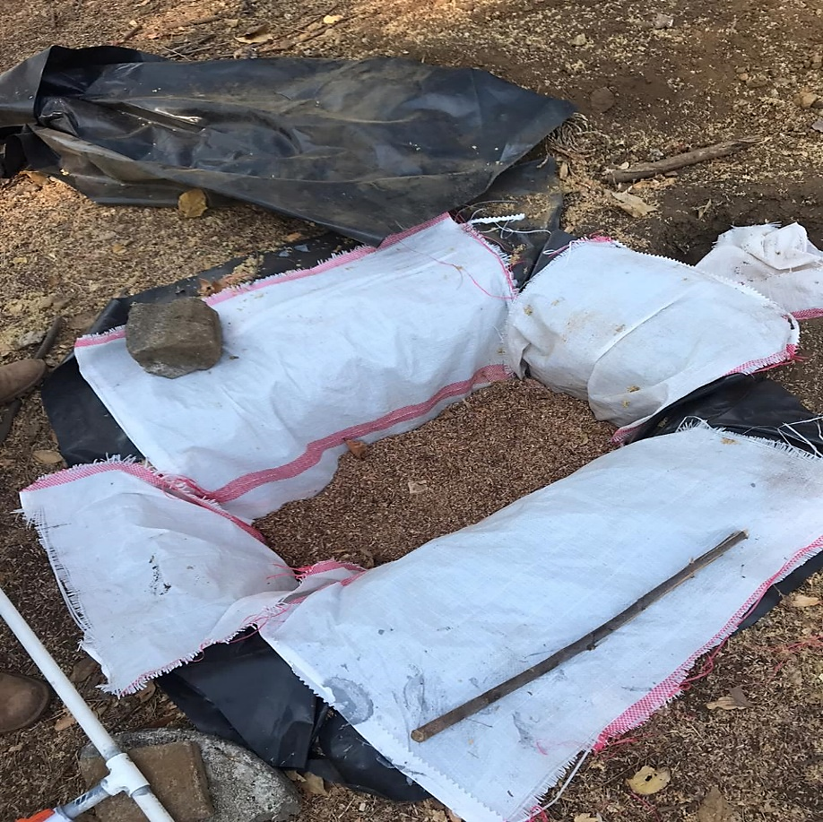 En la figura 9, podemos apreciar la construcción e impermeabilización con saco macen y plástico negro de las barreras. Una vez seleccionado el sustrato a utilizar, una de las barreras se rellenó solo con suelo del sitio a modo de punto control y la otra con aserrín, posteriormente a este se le adiciono el sistema de simulación de agua de escorrentía superficial agrícola.
