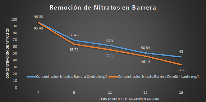 La eficiencia de remoción para la barrera desnitrificante fue de 66 % un porcentaje de remoción alto, siendo este un poco más de lo esperado, si se toma en cuenta que fue un proyecto experimental a escala piloto. Al correlacionar ambos datos, se obtuvo un mayor porcentaje de remoción con la barrera control en vista a que la materia orgánica externa juega un rol fundamental en los procesos de desnitrificación. (Bednarek, Szklarek, & Zalewski, 2014).