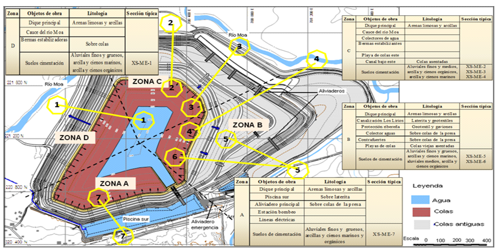Hernández (2015) en su investigación propuso la sectorización de la presa de colas No. 2 en cuatro zonas (A, B, C y D) con el objetivo de realizar un análisis detallado de la vulnerabilidad de la obra, partiendo de la identificación de los peligros de origen natural y antrópico de la presa de colas. El comportamiento geotécnico de la presa bajo condiciones estáticas y pseudoestáticas se analiza a partir de varias secciones transversales por zonas (ver Figura 2).