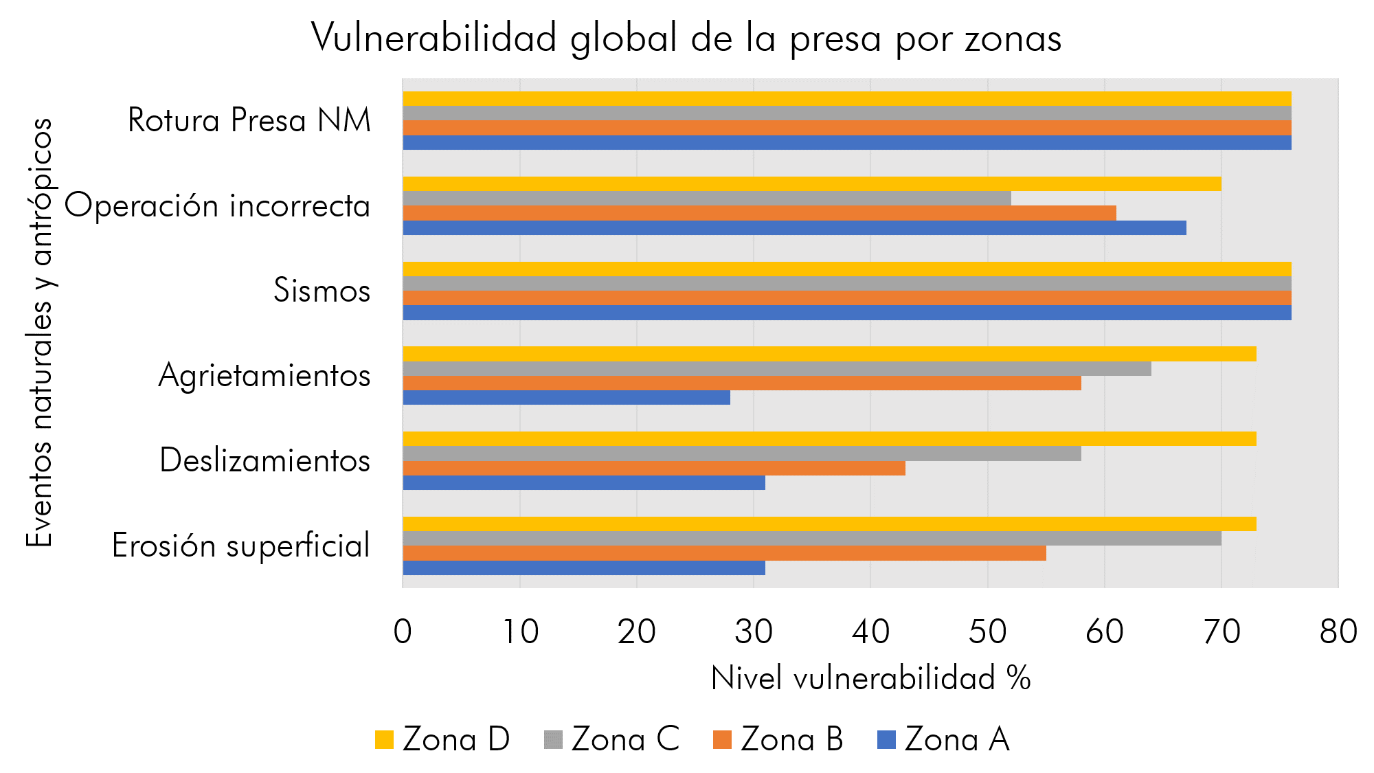 La evaluación de la vulnerabilidad global en cada una de las zonas de la presa de colas por tipo de eventos, se detalla a continuación: