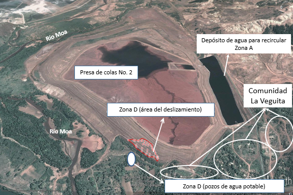 La ocurrencia del fallo de varios diques de la presa de colas en el año 2014 constituye una combinación de la confluencia de peligros de origen hidrometeorológico y tecnológico, esto provocó daños significativos por contaminación a la comunidad de La Veguita, la economía y al medio ambiente, además existió un alto riesgo de contaminación para los pozos de agua de abasto al 30 % de la población del municipio, así como el río Moa y los bosques de galería del entorno. Ver Figura 5.