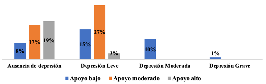 En el análisis de la depresión se pudo determinar que el más alto porcentaje se encuentra en depresión leve de los cuales la mayor parte tenían un apoyo social moderado siendo el mayor porcentaje entre los evaluados. La prevalencia de depresión grave fue muy baja y tenían un apoyo social bajo; en los casos que hubo ausencia de depresión hubo un bajo porcentaje de apoyo bajo y prevaleció el apoyo social alto; en los casos que se encontró depresión moderada hubo en su totalidad apoyo social bajo. El apoyo social alto se encontró casi en su totalidad en los casos donde había ausencia de depresión.