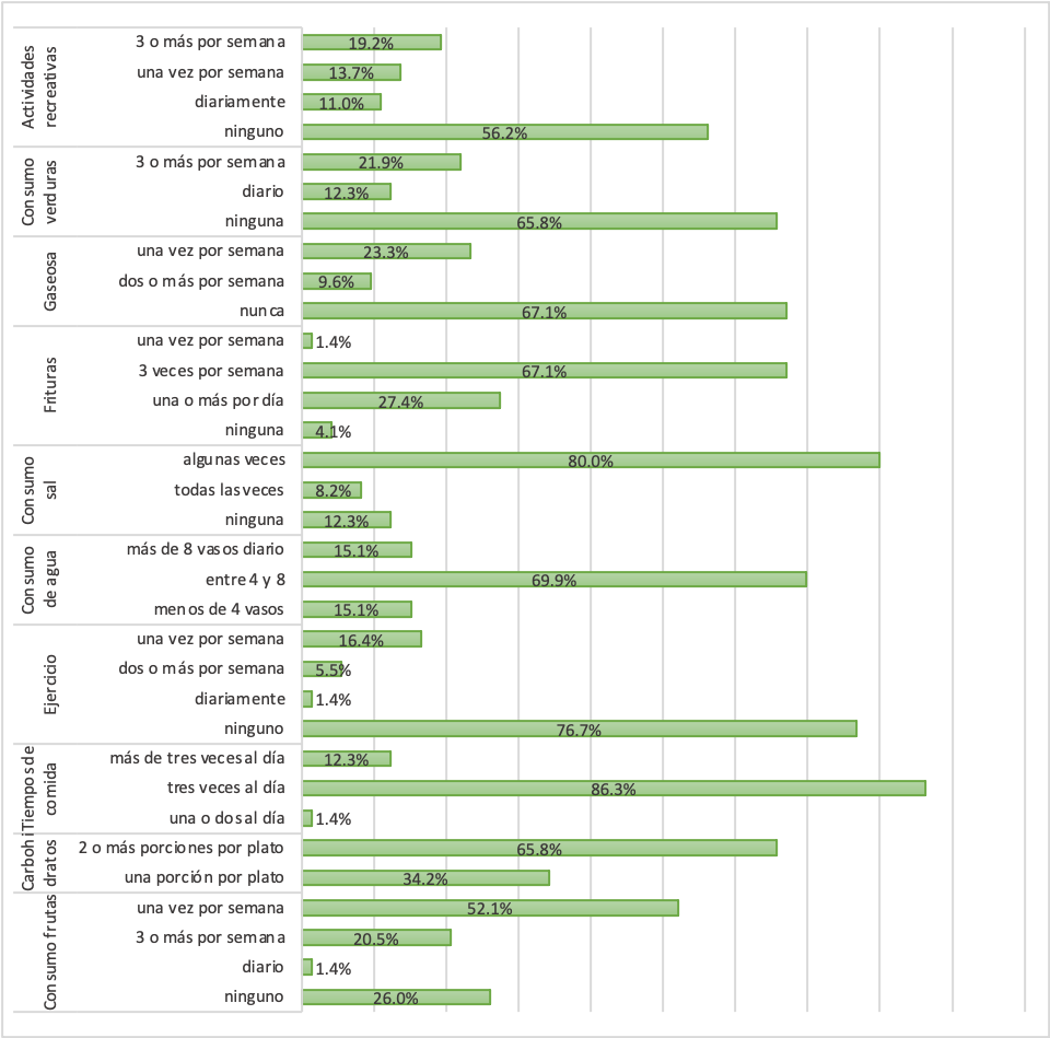 En el consumo de agua la mayor parte de la población (70%) no consume la cantidad adecuada a pesar de las condiciones climáticas y el acceso adecuado a la misma al igual que en la realización de ejercicio en la cual el 77 % de ellos no realiza ningún tipo de ejercicio lo cual constituye un factor de riesgo.