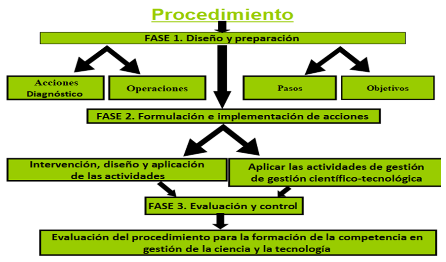 FASE 1. Diseño y preparación: es la fase inicial del procedimiento, cuando se ejecutan las acciones necesarias para sentar las pautas para su desarrollo. Tiene como objetivo instruir a los directivos y profesores que conducirán el proceso formativo de la competencia en gestión de la ciencia y la tecnología.