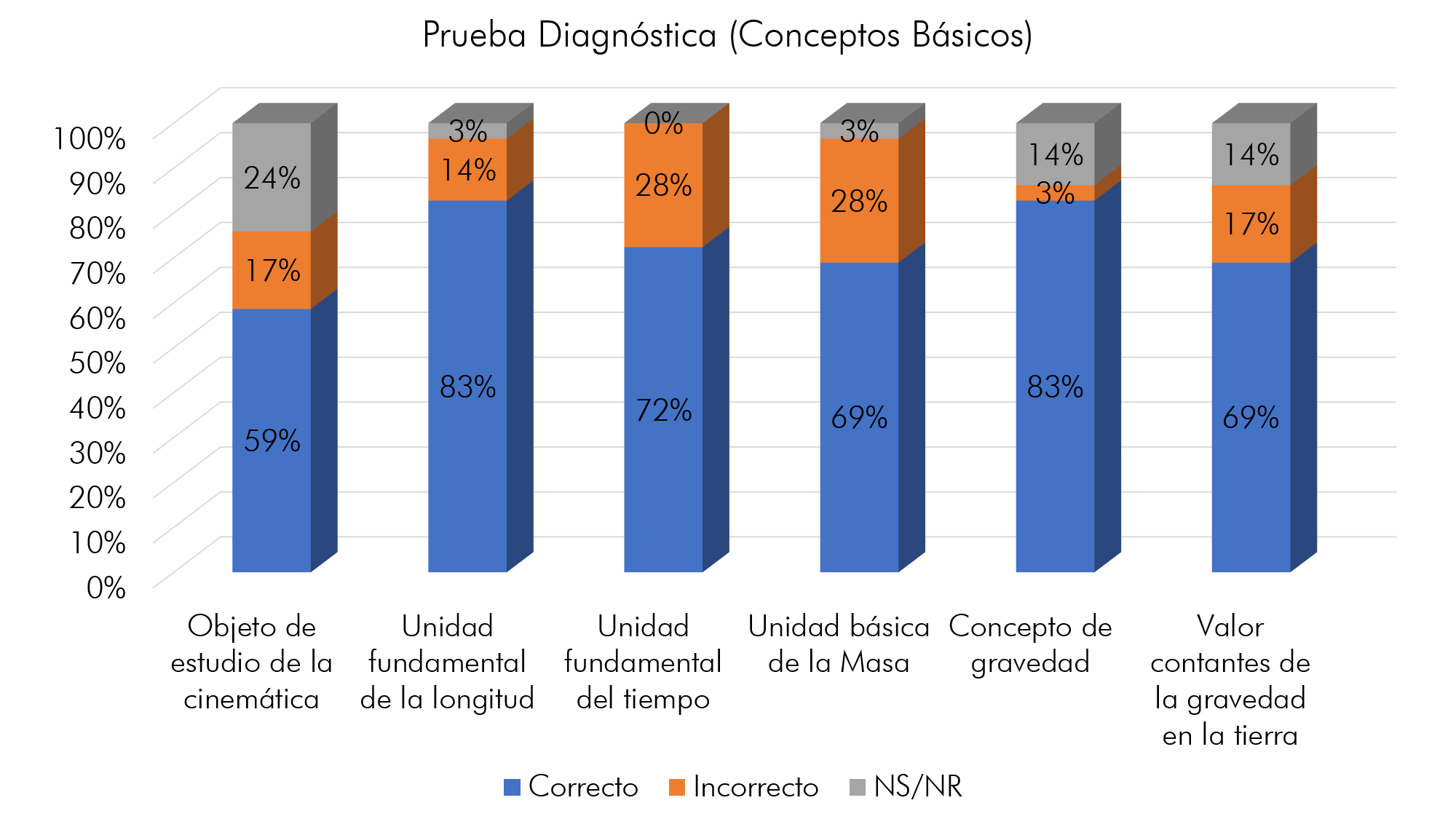 Nota: La figura muestra los resultados obtenidos en la prueba diagnóstica en relación con los conceptos básicos, detallando el porcentaje de estudiantes que contestaron correcto, incorrecto o no sabe/no respondió.