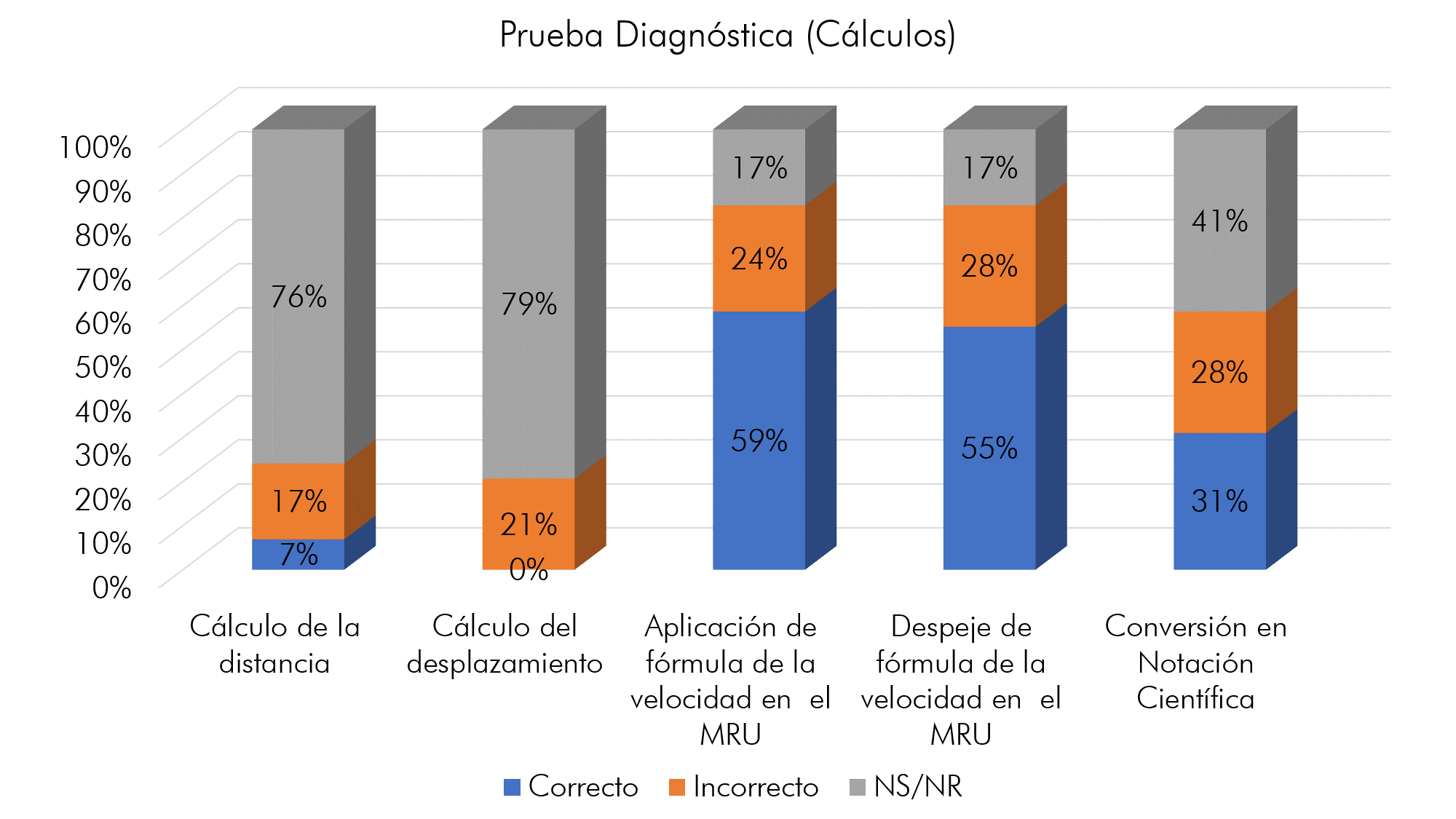 Nota: La figura muestra los resultados obtenidos en la prueba diagnóstica en relación con los cálculos esenciales, detallando el porcentaje de estudiantes que contestaron correcto, incorrecto o no sabe/no respondió.