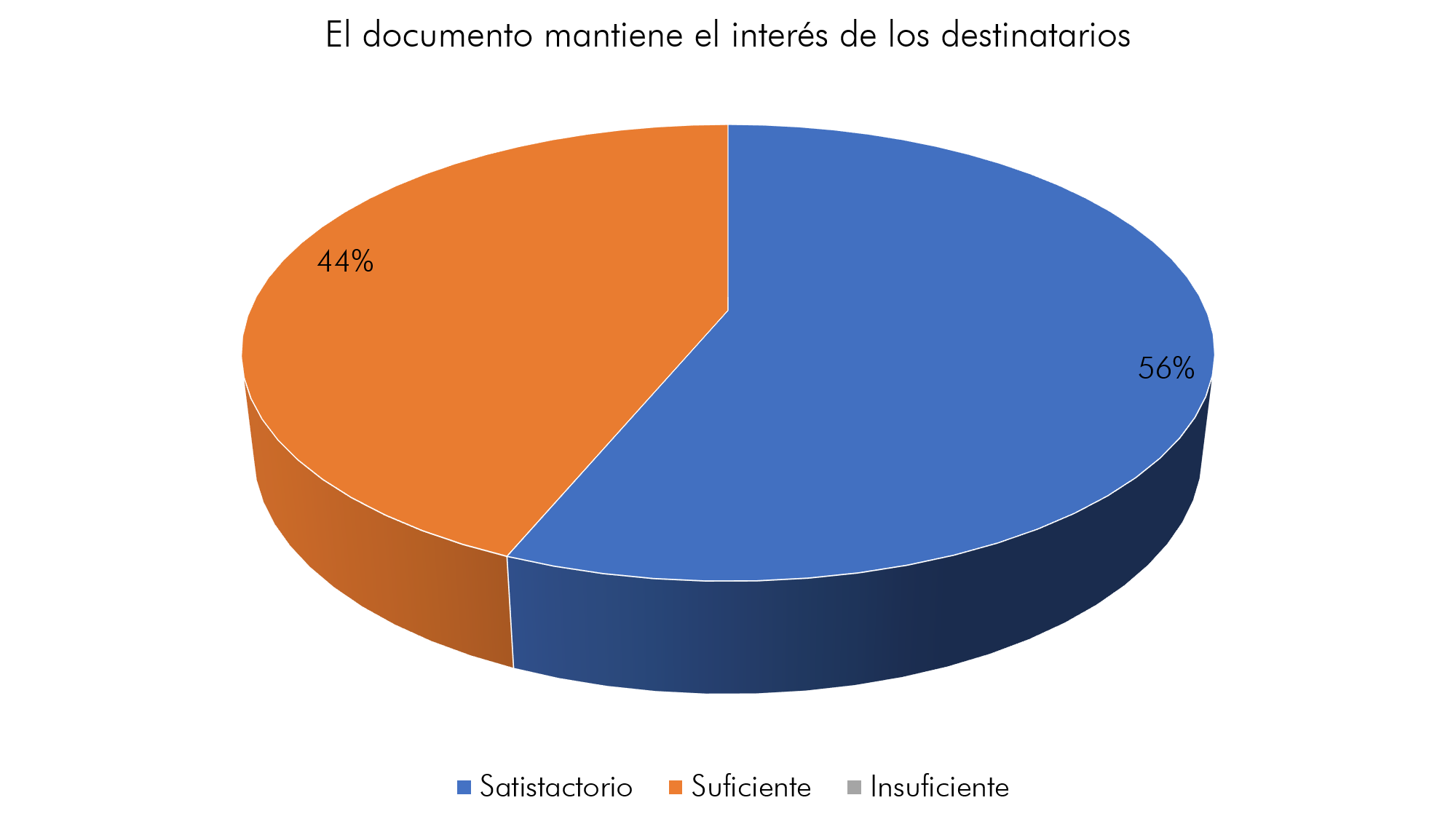 De acuerdo con la figura 4 los estudiantes consideran que el documento mantiene el interés de los destinatarios, calificándolo como satisfactorio (56%) y suficiente (44%), indicando que para el 100% de la muestra los documentos facilitados fueron aceptados en relación a este parámetro.