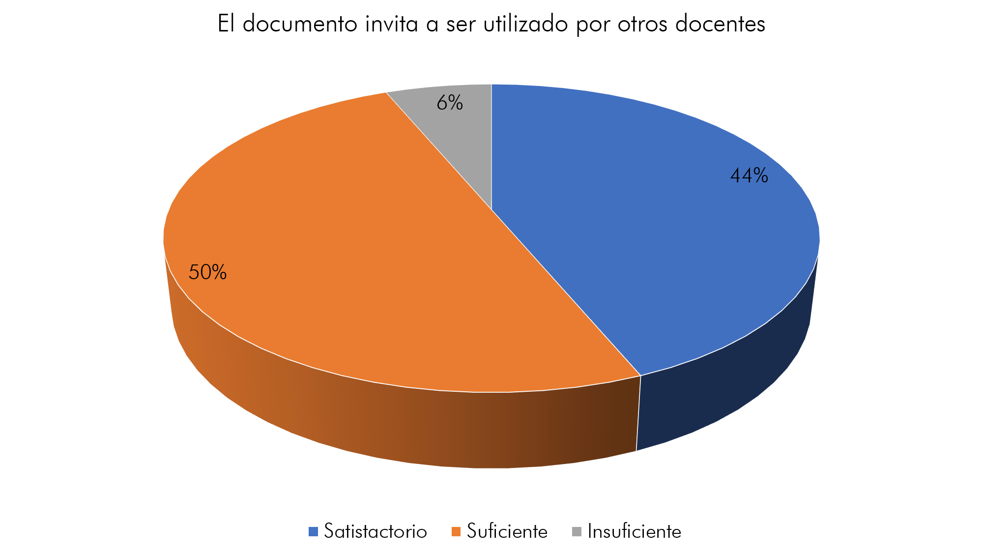 Considerando que los estudiantes seleccionados para la muestra de esta investigación serán los futuros transmisores de conocimientos en las aulas de clase, la figura 5 muestra la evaluación de los documentos facilitados, respecto a la utilidad de estos para otros docentes, en donde el 94% de los estudiantes evaluaron como satisfactorio (44%) y suficiente (50%) los documentos, para ser utilizados por otros docentes.