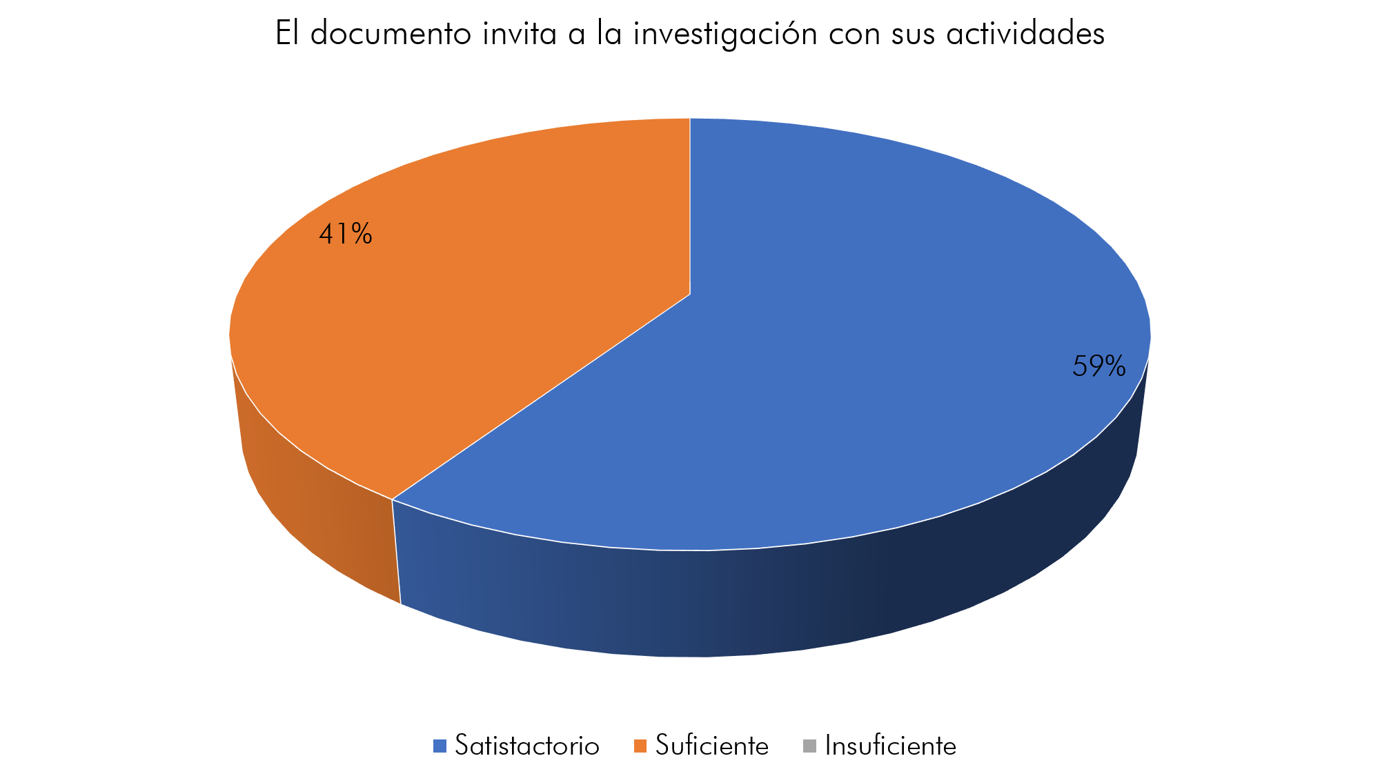 Los documentos facilitados según la figura 6 invitan a la investigación con sus actividades para un 59% de la muestra calificándolo como satisfactorio y un 41% lo considera suficiente.