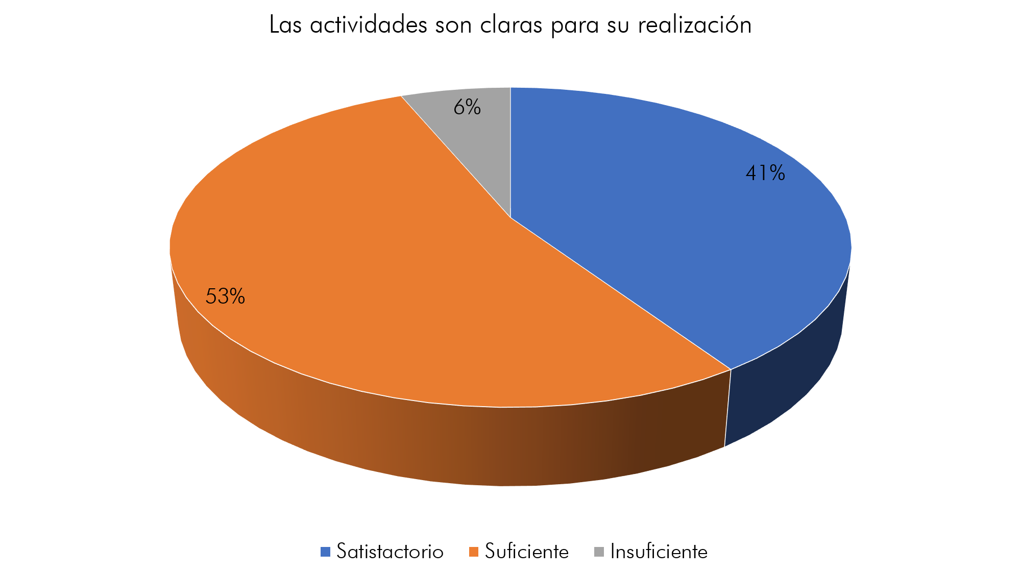 Respecto a la figura 7 los estudiantes consideran que las actividades presentadas en los documentos han sido planteadas con claridad para su comprensión y realización, evaluando un 41% como satisfactorio, 53% suficiente y 6% como insuficiente.