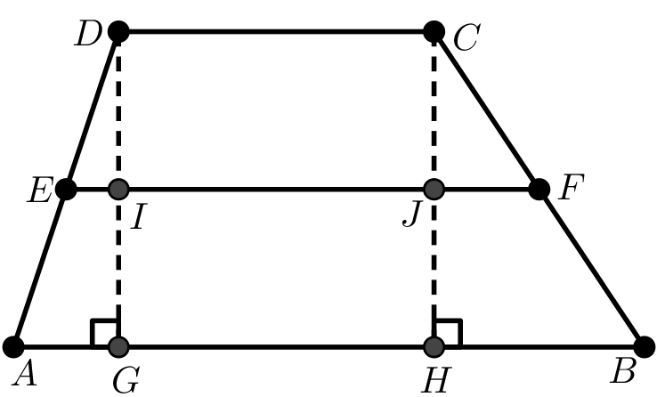 Dado que la distancia entre dos rectas paralelas es la misma (Velásquez et al., 2019) los triángulos ∆DEF y ∆FCD tienen altura 1/2 DG. Similarmente, como HG=1/2 DG, resulta que la altura de los triángulos ∆AEB y ∆BFE también es 1/2 DG. Esto deja en evidencia que los cuatro triángulos en que se descompone el trapecio tienen como altura 1/2 DG.