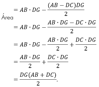 Note que el trapecio se descompone en dos triángulos rectángulos (∆DGA y ∆CHB) y un rectángulo (DCHG). Luego, por las fórmulas de área de un triángulo y un rectángulo (Velásquez et al., 2019, pp. 153-154),
