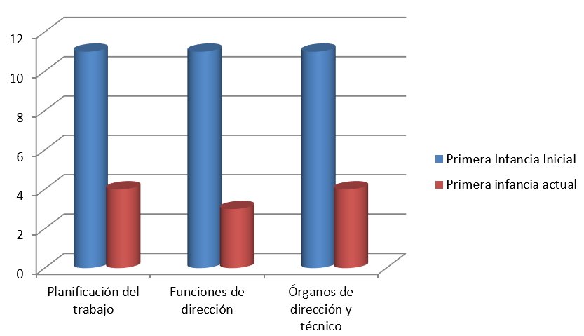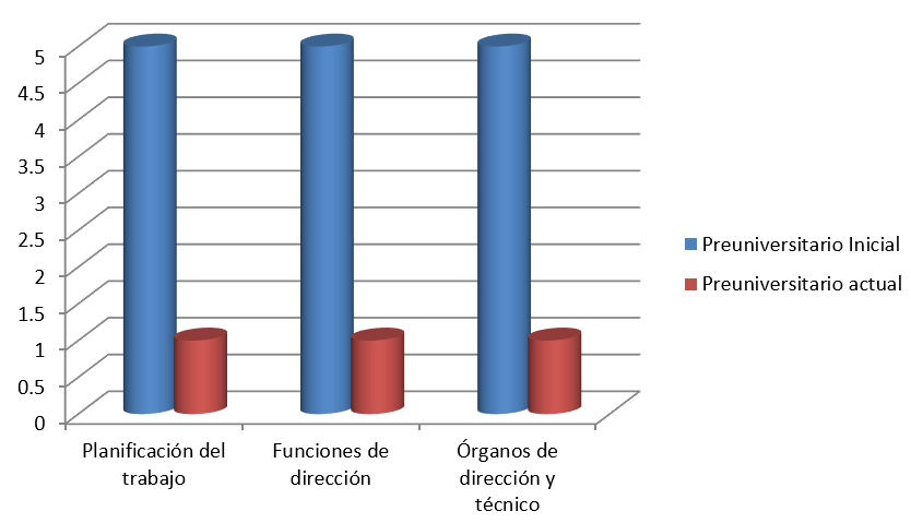 Hasta donde se ha adelantado en la implementación del programa de entrenamiento conjunto se evidencia un avance en cuanto a la preparación adquirida. En la primera infancia de la muestra de once cuadros y de cinco en preuniversitario han avanzado en cuanto a la implementación desde la planificación del trabajo el conocimiento de las funciones de dirección, en la preparación y ejecución de los órganos de dirección y técnicos siete y cuatro respectivamente, aparejado a una toma de decisiones más acertadas en los mismos logrando una mejor conducción del proceso de dirección educacional (Anexo 1).