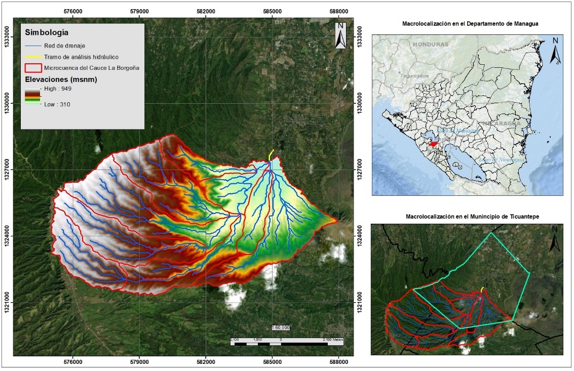 Se delimitó una microcuenca a partir de la ubicación del área de estudio, la cual corresponde al sector oeste de la comunidad La Borgoña en el Municipio de Ticuantepe, Departamento de Managua. La microcuenca delimitada (la cual se ha nombrado como microcuenca del cauce La Borgoña, con área total de 62.04 km2) se ubica en la parte superior de la subcuenca III de Managua, la cual es una Unidad Hidrográfica ubicada en el nivel 7 (UH-9529134) según la metodología Pfafstetter. En la figura 1 se muestra la microcuenca delimitada a partir de la sección inicial del canal natural tomado como área de estudio.