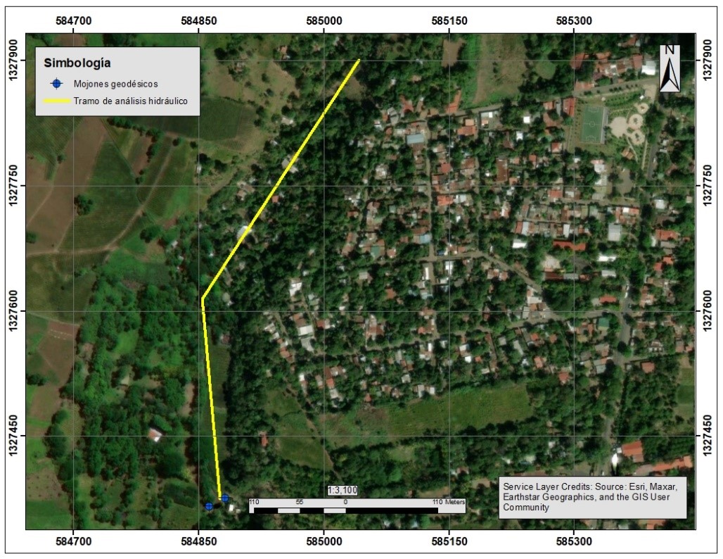 Específicamente, se consideró un tramo de 740 metros (ver figura 2) que comprende un área habitada y caracterizada como una zona con moderado nivel de amenaza a inundación de acuerdo al mapa de amenaza presentado en el Plan Municipal de Ordenamiento y Desarrollo Territorial 2012-2022 (FUNDAR, 2013).