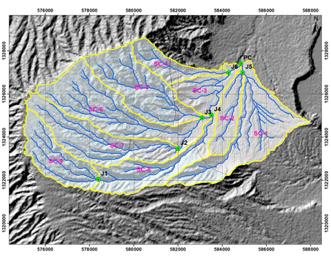 La microcuenca fue divida en 9 unidades de drenaje, de manera que se obtuviera un caudal total en el punto de cierre o encauzamiento aplicando enrutamiento hidrológico, utilizando en este estudio el método de Muskingum, donde el parámetro K se estimó con base en el tiempo de concentración de cada unidad de drenaje y la longitud de su cauce principal respectivo; y el parámetro X se ha considerado en 0.2 para todas las unidades de drenaje, debido a falta de información, a como sugiere Aparicio (1992). Los puntos considerados para el enrutamiento se muestran en la figura 3 y los parámetros estimados se muestran en la tabla 1.
