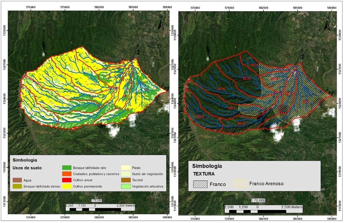 Para cada una de estas unidades se estimó un valor de número de curva considerando condiciones normales de humedad antecedente (CN AMC II); para ello se empleó la información de usos y textura del suelo del área estudio, la cual se obtuvo de los mapas confeccionados en el año 2015 por el Instituto Nicaragüense de Estudios Territoriales (INETER). Las clases texturales del suelo que existen en la microcuenca son franco arenoso y franco, correspondientes a los grupos hidrológicos de suelo A y B respectivamente según NRCS (2009), mientras que el uso del suelo predominante es el cultivo permanente (ver figura 4). A través del procesamiento de datos de uso y tipos de suelo la microcuenca se estimó para cada unidad de drenaje un valor de Número de Curva (ver la tabla 2).