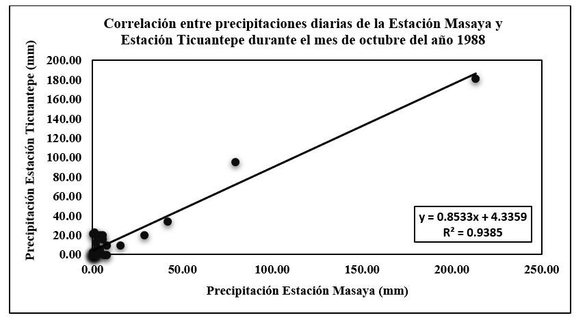 Este procedimiento se realizó debido a que la Estación Ticuantepe no cuenta con registro pluviográfico y se observa una correlación significativa entre ambas estaciones para el mes de octubre del año 1988 (ver figura 5), por lo cual se infiere que el comportamiento de la tormenta que se pudiese haber observado en la Estación Ticuantepe, es similar a la tormenta observada en la Estación Masaya. En la figura 5 se muestra el grado de correlación lineal de las precipitaciones entre ambas estaciones para el mes de octubre del año 1988.