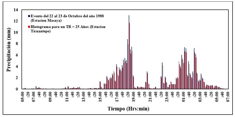 En lo que respecta a la tormenta de diseño, se confeccionó un hietograma con duración total de 24 horas para la Estación Ticuantepe (690124) asociado a un período de retorno de 25 años, basado en la lectura de la banda pluviográfica de la Estación Masaya (690115) para el evento ocurrido entre el 22 y 23 de octubre del año 1988. Ambas estaciones son administradas por el Instituto Nicaragüense de Estudios Territoriales (INETER).