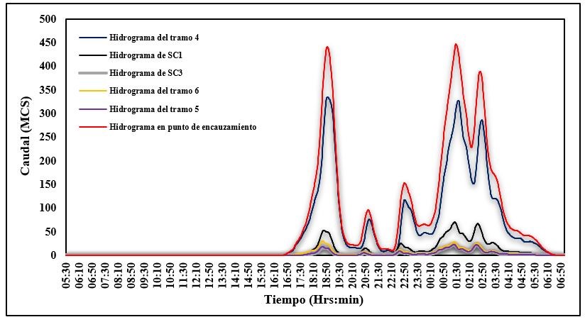 Obsérvese en la figura 7, que el hidrograma con más aproximación al hidrograma generado en el punto de encauzamiento (curva color rojo), es el hidrograma aportado por el tramo 4 (curva color azul). Esto se debe a que este tramo confluye los enrutamientos de los hidrogramas generados en las unidades de drenaje SC-5, SC-7 y SC-9. Los demás hidrogramas observados en la figura 7 (hidrogramas SC1, SC-3, tramo 6 y tramo 5) son aportaciones unitarias directas al punto de encauzamiento de la microcuenca.