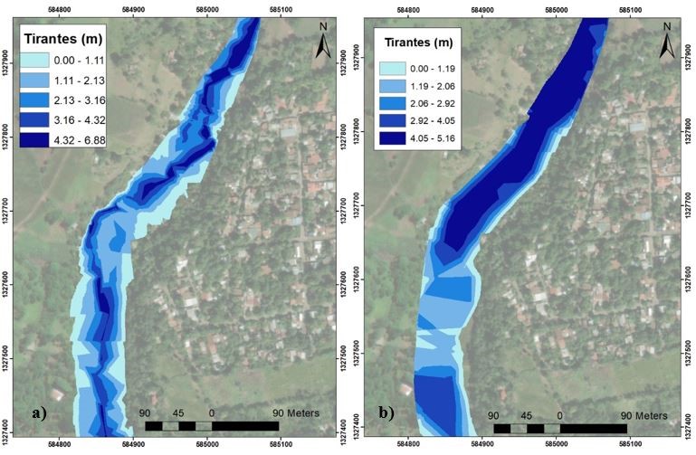 Figura 8. (a) Tirantes hidráulicos en simulación de referencia. (b) Simulación empleando el MDE ALOS PALSAR