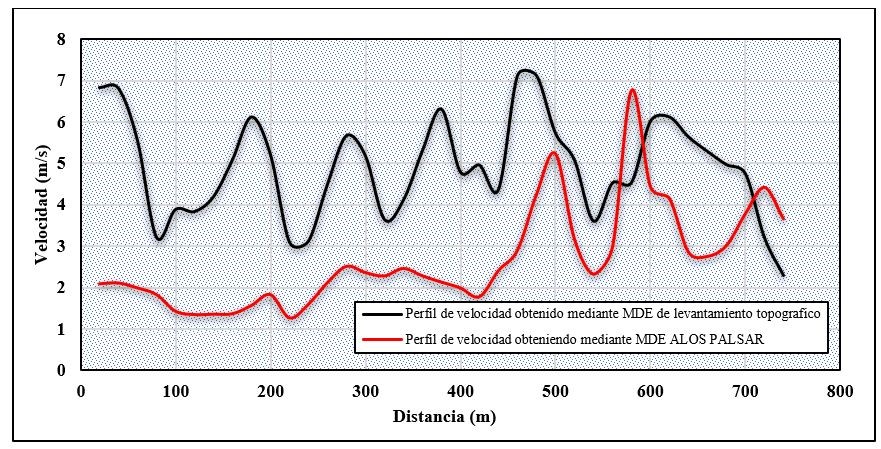 Al calcular el NSE y RSME considerando los tirantes simulados, se obtuvieron valores de -3.38 y 1.65 respectivamente, lo que evidencia la discrepancia entre los resultados obtenidos al emplear el MDE ALOS PALSAR, respecto a la simulación de referencia. Al considerar las velocidades de flujo, se obtuvo un NSE de -4.21 y un RSME de 2.71; la variación en la velocidades de flujo en perfil longitudinal del canal pueden observarse en la figura 9. Según lo establecido por Moriassi et al. (2007) la evaluación de los resultados del modelo sería insatisfactoria bajo las circunstancias simuladas a partir de las métricas estadísticas consideradas.