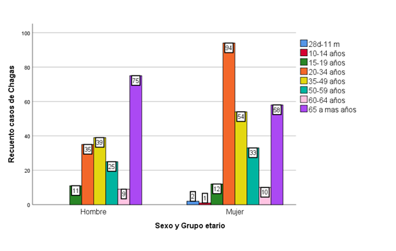 Respecto a los grupos etarios más afectados fueron de 20-34 años y de 65 años a más, demostrándose que la población adulta mayor fue la más afectada, ya que fueron diagnosticados en su fase clínica crónica que es la forma más común de diagnóstico de la enfermedad de Chagas por ser mayormente asintomática. La población adulta joven en segundo lugar fue la más afectada, aquí se incluye mujeres en edad fértil y embarazadas o pacientes inmunocomprometidos (con Tuberculosis o SIDA). Con un porcentaje muy mínimo fue afectado el grupo etario de 28 dias-11 meses, dato que demostró la efectividad en la prevención de la transmisión vertical de la enfermedad de Chagas en el departamento de Madriz.