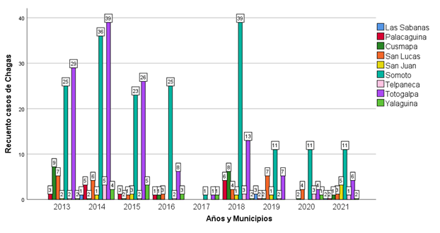 Los municipios con mayor número de casos fueron: Somoto, Totogalpa y San Lucas, esto obedece al alto porcentaje en población rural que presentan, alto número de casas construidas de adobe con techo de paja o zinc y gran número de habitantes. De forma opuesta, Las Sabanas fue el municipio menos afectado, con una población pequeña cercana a los 5 mil habitantes, mayormente urbana y periurbana. En el departamento de Madriz previo al 2013 se diagnosticaron 786 casos de enfermedad de Chagas, este dato demuestra la efectividad de las medidas preventivas en el departamento para el control de los vectores de la enfermedad de Chagas con una reducción drástica en el número de casos diagnosticados de menos 328 casos en el período 2013-2021 y con tan sólo 2 fallecidos.