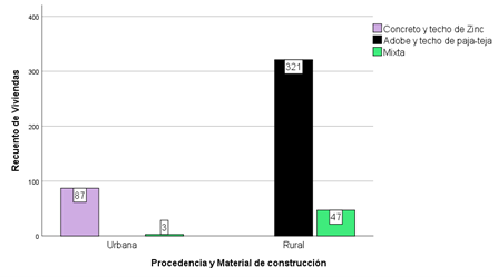 La figura 3, muestra los casos de Chagas por procedencia y estructura de las viviendas, en ella se observa que las casas construidas con adobe y techo de paja o de teja fueron 321 y de procedencia rural, las casas construidas con concreto y techo de zinc fueron 87 y de procedencia urbana, y sólo 3 casas construidas con material mixto de procedencia rural y 47 casas de procedencia urbana.