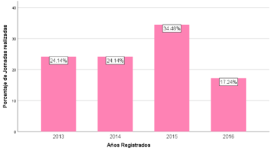 En la figura 4, se observa las jornadas de rociado realizada en 4 años registrados, el 2015 se destaca más con 34.47 % (10 jornadas) y el 2016 menos con 17.24 % (5 jornadas).