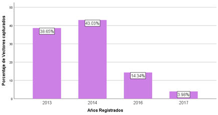 La figura 5 muestra los vectores capturados para estudio por años registrados, destacando más el año 2014 con 43 % (108 vectores) y el menos destacado es el año 2017 con 3.9 % (10 vectores).