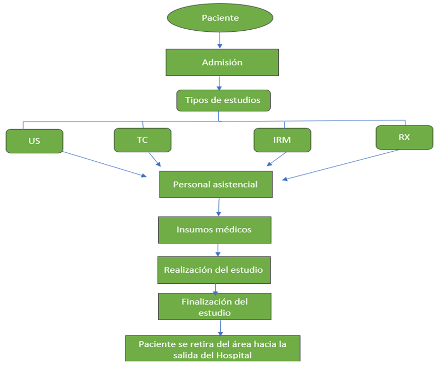 El siguiente flujograma (Figura 2) muestra la atención del paciente desde que llega al Hospital y pasa por la admisión para la realización del estudio imagenológico, según el asignado por el médico tratante. Posterior, el personal de enfermería o técnico asiste al paciente y explica el tipo de estudio a realizar, ahora bien, dependiendo de qué tipo de estudio que se realice, se le asignan los insumos médicos relacionados y se realiza el estudio. En el caso de tomografía y resonancia demora entre 45 minutos, una vez realizado el paciente se retira del área.