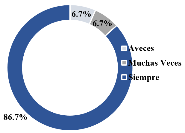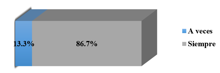 Del uso de equipos de protección personal de la población encuestada como son el uso de gabacha, guantes, mascarilla, etc., refirieron que siempre los utilizan dentro de sus áreas de trabajo en un 86.7%, esto se asemeja con el estudio de Barrios (2015) donde el 88.4% usan sus equipos de protección al manipular algún tipo de material biológico en la atención al paciente, tomando en cuenta la Norma Técnica sobre las disposiciones mínimas de higiene y seguridad de los “equipos de protección personal”, donde en su Artículo 3 cita textualmente que “los equipos de protección personal deberán utilizarse de forma obligatoria y permanente cuando los riesgos no se puedan evitar o no puedan limitarse”, y está relacionado en cuenta el ambiente laboral donde ejercen sus funciones existe alto riesgo de tipo biológico así también se cumple con la disposición sobre el uso de prenda lo cuales son seleccionada en base a las condiciones de trabajo (NT, 1996).
