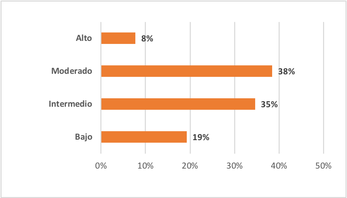 Al analizar el nivel de estrés utilizando la encuesta laboral de OIT-OMS, se encontró que de los 26 participantes 38% (10) presentaban un nivel moderado de estrés, 35 % (9) tenían un nivel intermedio de estrés, 19 % (5) un nivel bajo de estrés y tan solo el 8% (2) presentaron un nivel alto de estrés.