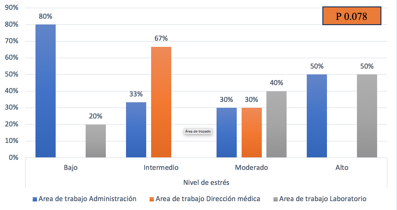 Se demostró que no existe relación entre el nivel de estrés laboral que tienen los colaboradores y el área de trabajo en la que se desempeña, ya que p es mayor que 0.05 (0.078). Esto significa que el nivel de estress que presenta la población de estudio no está relacionado con el área de trabajo donde se desempeñan porque el nivel de significancia es alto. Los trabajadores que poseen un nivel de estrés bajo están en el área de administración 80% (4) y laboratorio 33% (1). Nivel de estrés intermedio el área de administración 33% (3) y dirección médica 67% (3). Estrés moderado en la dirección médica 30% (3), así también en igual proporción el área de dirección médica y en mayor proporción el área de laboratorio 40% (4). Y los que cuentan con un alto nivel de estrés es una persona de administración (50%) y una persona de laboratorio (50%).