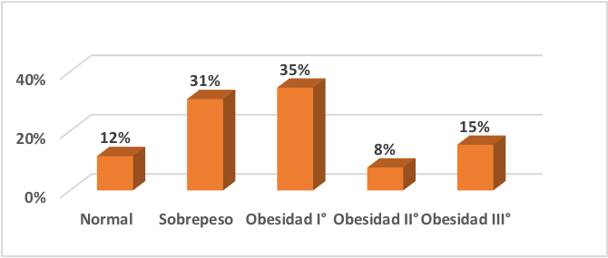 En el presente estudió se reveló que el 35% (9) de la población en estudio tiene obesidad I°, el 31% (8) sobrepeso, obesidad III° el 15% (4), el 12% (3) se encontraba en normopeso y en obesidad II° (2). Este resultado fue parecido al que se encontró en la investigación realizada en el Hospital Carlos Marx, que evidenció que 61 médicos, 49.2% (30) están con sobrepeso, 21.3% (13) en obesidad I, el 19.7% (12) tienen peso normal y 9.8% (6) en obesidad II (Dinarte Jarquín, 2019).