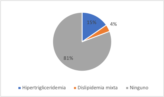 Con relación al nivel de estrés y perfil de lípidos, resultó que el personal que posee hipertrigliceridemia, el 40 % (2) tiene nivel de estrés bajo, el 11 (1) % nivel de estrés intermedio y el 10 (1) % tiene nivel de estrés moderado. Los que presentaban dislipidemia mixta el 11% (1) tiene nivel de estrés intermedio. Y los que no presentaban trastornos en el perfil lipídico, el 60% poseía nivel de estrés bajo, el 78% nivel de estrés intermedio, el 90% nivel de estrés moderado y el 100% que no presentaron alteraciones en el perfil lipídico tenían nivel de estrés alto.