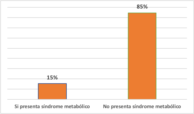 El 85% (22) del personal en estudio no presentan y el 15% (4) si presenta síndrome metabólico. (Dinarte Jarquín, 2019) encontró ausente el síndrome metabólico el 60.7% y presente en el 39.3%. La población en general está expuesta a padecer enfermedades cardiovasculares y diabetes, más aquellos que ya tienen este síndrome, por lo que es importante detectar e incidir en cambios de estilo de vida, ejercicio y control del peso.