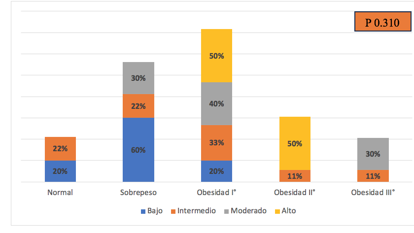 Se encontró que no existe una asociación estadísticamente significativa, dado que p es igual a 0.310. Sin embargo, el personal con obesidad I° predominó el nivel de estrés alto 50% (1), seguido de un nivel de estrés intermedio 11% (1) , nivel de estrés intermedio 33% (3) ,con obesidad II° predominó un nivel alto de estrés con 50 %(4), y del personal que tiene obesidad III°, predominó el 30 % (3) con un nivel de estrés moderado y un 11% (1) con nivel de estrés intermedio.
