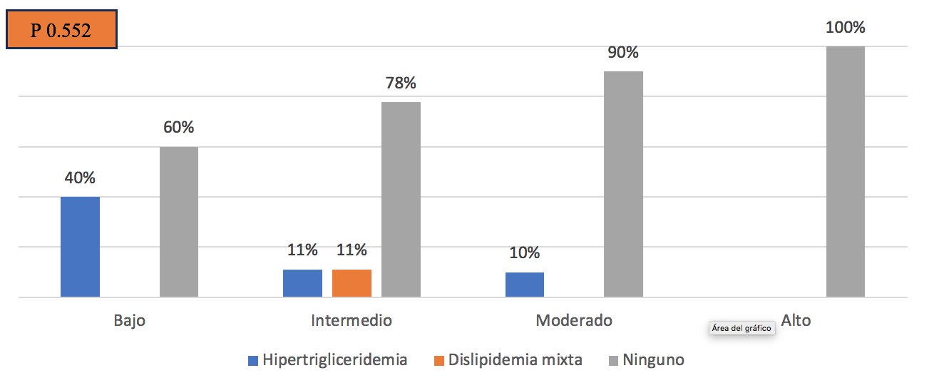 A pesar de que se encontró en un alto nivel de estrés, no existe una asociación estadísticamente significativa entre el nivel de estrés y trastornos del perfil de lípidos, ya que p es mayor que 0.05 (0.552)