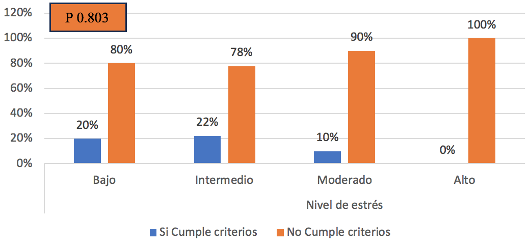 En relación con el nivel de estrés laboral y la presencia de síndrome metabólico, se encontró que los que tienen nivel de estrés bajo el 20% (1) cumple con criterios de síndrome metabólico, los que presentaron nivel de estrés intermedio fue del 22% (2), nivel de estrés moderado 10% (1) y ninguno de los que tenía nivel de estrés alto presentaron criterios para síndrome metabólico.