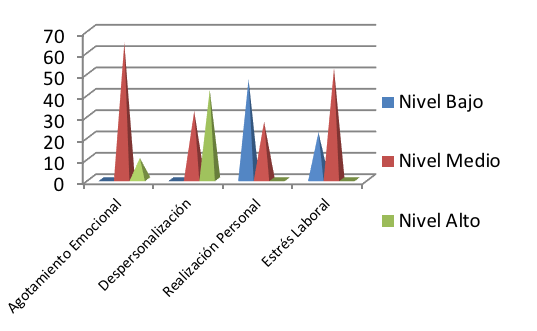 El 84.2% de los directivos encuestados refiere niveles medios de Agotamiento Emocional, los niveles de despersonalización donde se valora el paralelismo en el que cada sujeto experimenta actitudes de frialdad y distanciamiento se reflejan en el 42.1% de la muestra, así como niveles predominantemente bajos (61.8%) de realización personal; el 68.4% de los sujetos encuestados mantienen niveles medios percibidos de estrés, constatado en entrevistas a los participantes y la observación durante todo el estudio.