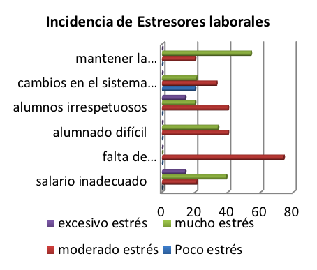 La evaluación del Inventario de estrés para docentes y La Escala Sintomática de Estrés: mostró la medida de que el 68.4% de los sujetos encuestados mantienen niveles medios percibidos de estrés, con predominio de síntomas como temor, inseguridad, dificultad para pensar, pérdida de memoria, ansiedad, irritabilidad, tristeza, apatía, fatiga, indecisión, pérdida de la autoestima, trastornos respiratorios y cardiovasculares, diarreas estreñimientos, pérdida o aumento de apetito, sociales como problemas y ausentismo laboral, competitividad exagerada, aislamiento social, insatisfacción, bajo desarrollo personal, agotamiento emocional sostenido en el tiempo, insatisfacción.